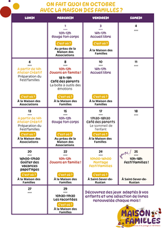 Pour cette deuxième édition du Festi'Familles, nous vous donnons rendez-vous samedi 25 octobre à partir de 10h.